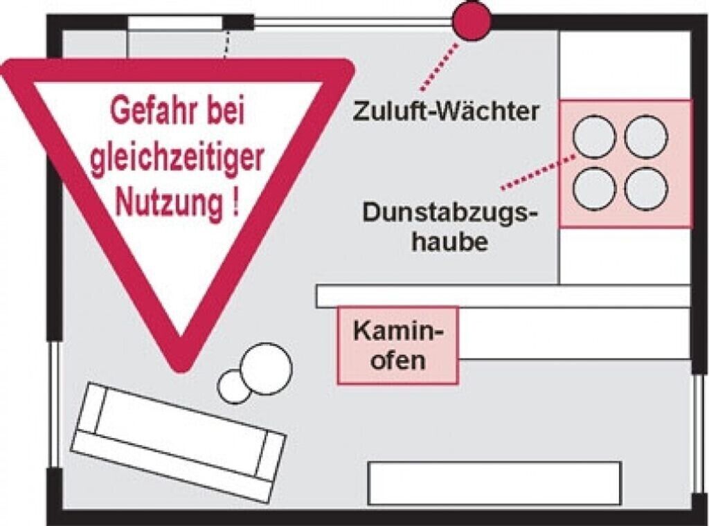Bei gleichzeitigem Betrieb von offenen Feuerstellen, z.B. Gasthermen, Kaminöfen etc, die an einen Schornstein angeschlossen sind, und einer Dunstabzugshaube besteht die Gefahr einer tödlichen Kohlenmonoxid-Vergiftung. Wenn die Fenster geschlossen sind, lässt die Dunstabzugshaube einen Unterdruck im Raum entstehen.